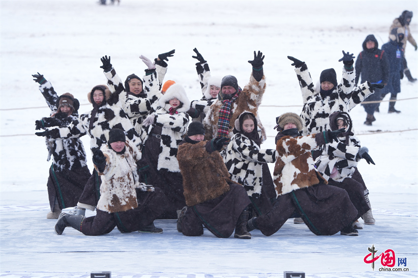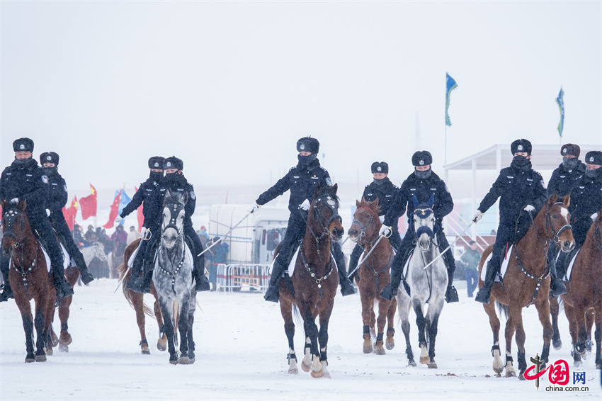 开幕式设计独具匠心,将草原文化与时代精神深度融合。以“雪域迎宾”为序章,汉蒙双语联袂主持,象征着各民族交往交流交融的和谐图景。100匹蒙古马组成的国旗方队——鲜艳的五星红旗在冰雪草原上飘扬,传递出草原儿女对祖国的赤诚热爱,随后入场的锡林浩特市公安局蒙古马骑警大队,展现现代草原守护者的飒爽英姿,引发观众热情欢呼。