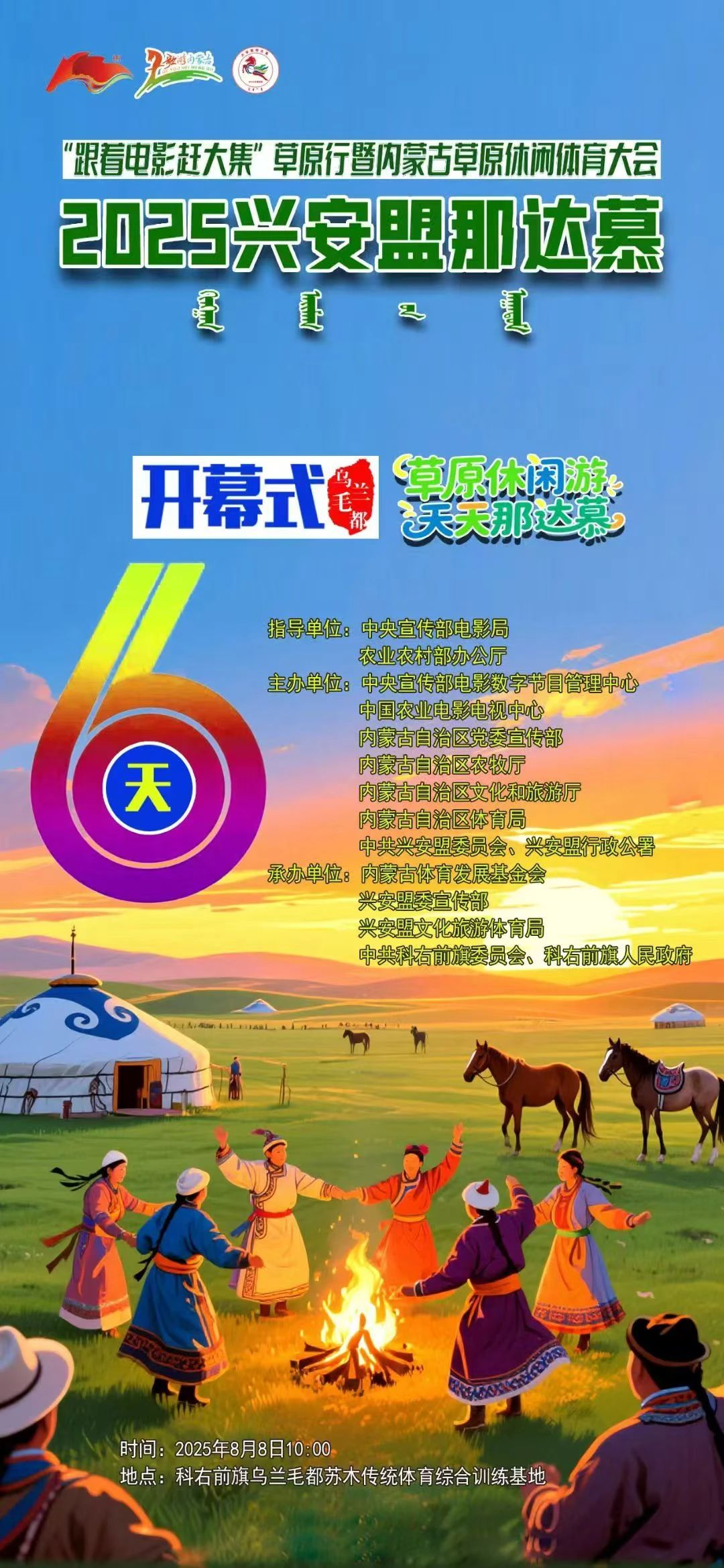 由中央宣传部电影数字节目管理中心、中国农业电影电视中心、内蒙古自治区党委宣传部、内蒙古自治区农牧厅、内蒙古自治区文化和旅游厅、内蒙古自治区体育局、中共兴安盟委员会、兴安盟行政公署主办的“跟着电影赶大集”草原行暨内蒙古草原休闲大会·2025兴安盟那达慕将于8月8日在科右前旗乌兰毛都苏木传统体育综合训练基地启幕。