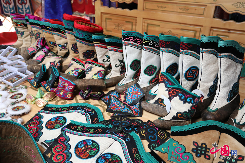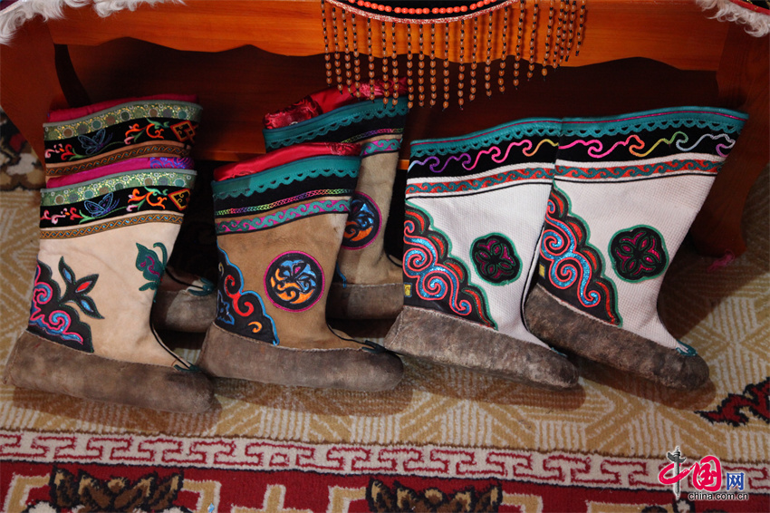 对于当地人来说,索海靴不仅是服饰,更是民族情感和文化传承的重要载体。数百年来,人们围绕索海靴创作了诸多传说、民歌,巴尔虎短调民歌《达岭图热易台固图勒》中唱到“索海固图勒的布靴筒上,缝饰了双层八副图案,缝饰的那双层八副图案,是那达日玛姑娘的手艺”,表达了人们对索海靴的喜爱和赞美。