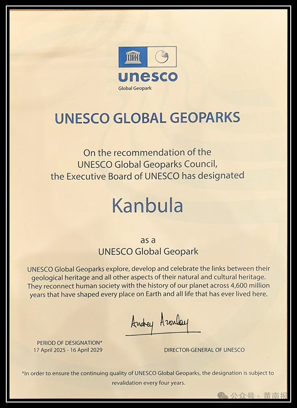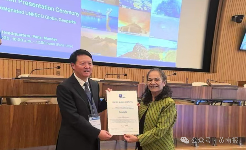 授牌仪式上,青海省黄南藏族自治州委书记朱战民作为坎布拉联合国教科文组织世界地质公园的代表,从教科文组织自然科学助理总干事莉迪亚·布里托女士手中接过了教科文组织总干事亲笔签署的“坎布拉联合国教科文组织世界地质公园”证书,这标志着坎布拉世界地质公园建设将迎来新的发展机遇。
