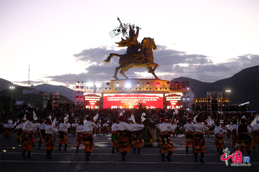 夜色渐浓,格萨尔王广场一侧的灯光球场里,当地年轻人畅快奔跑。另一侧,篝火正旺,舒展奔放的锅庄,引游客纷纷加入。