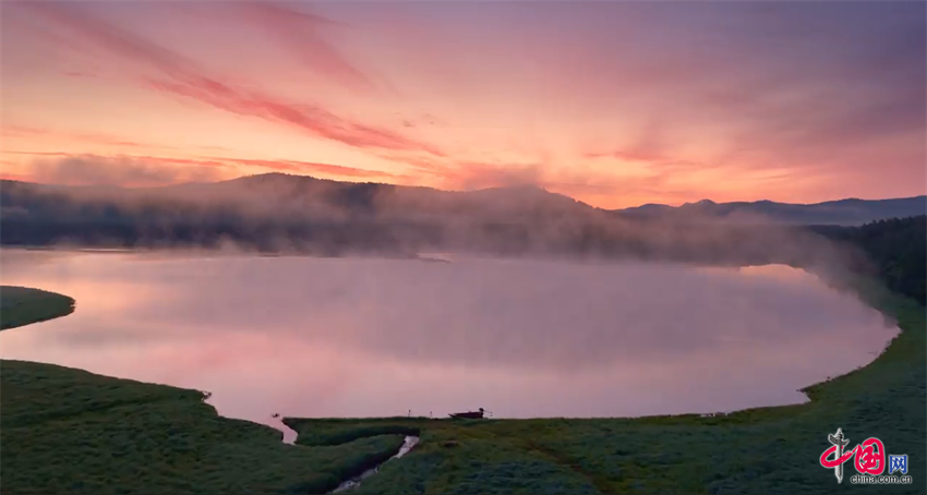 晨光初露时,内蒙古兴安盟阿尔山仙鹤湖畔的朝霞将天空染成一片梦幻的粉红色。