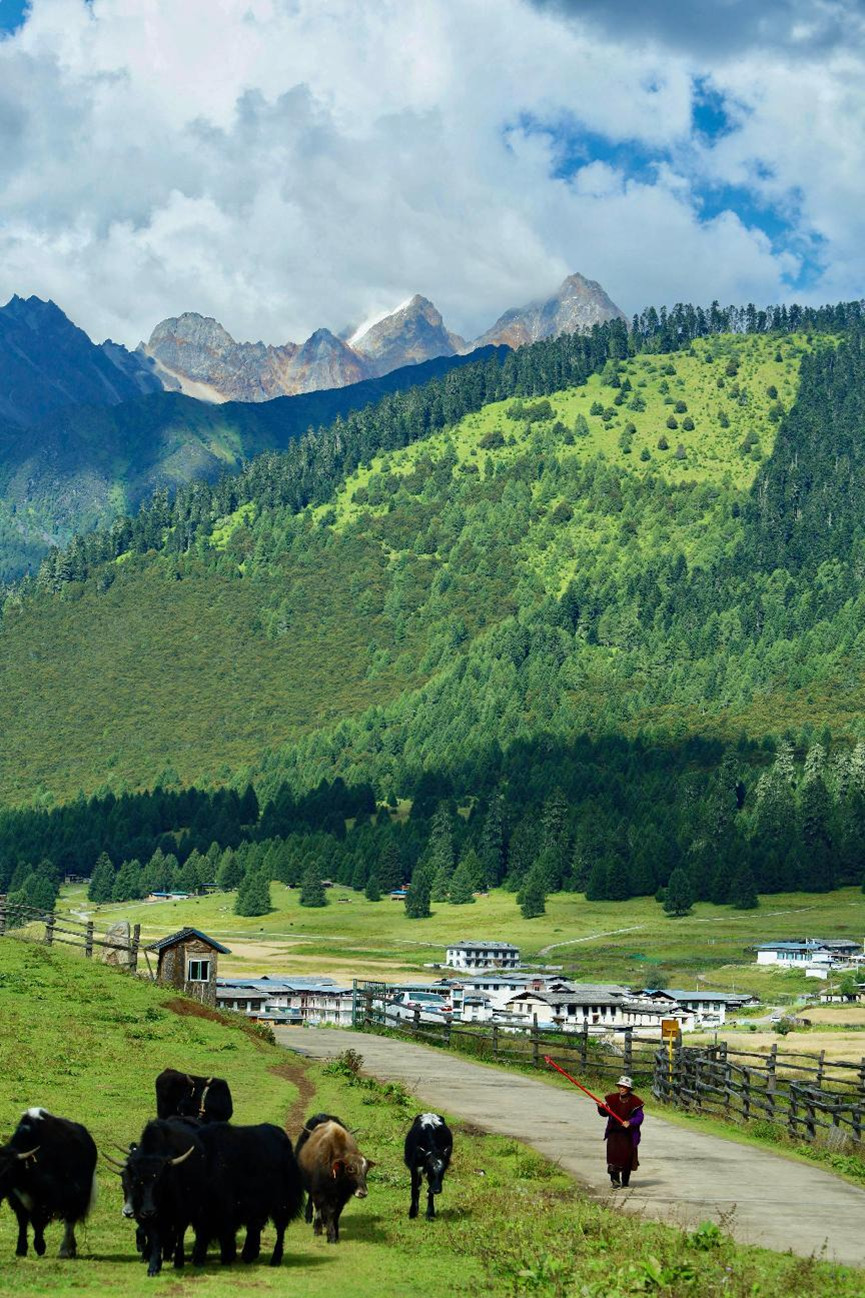 作品简介:(作者自述)作品拍摄于西藏林芝市巴宜区鲁朗镇,远处山峦巍峨,云雾缭绕,森林郁郁葱葱。山下,扎西岗村宁静祥和,屋舍错落有致。一位牧民身着传统服饰,手持牧鞭追赶牦牛。