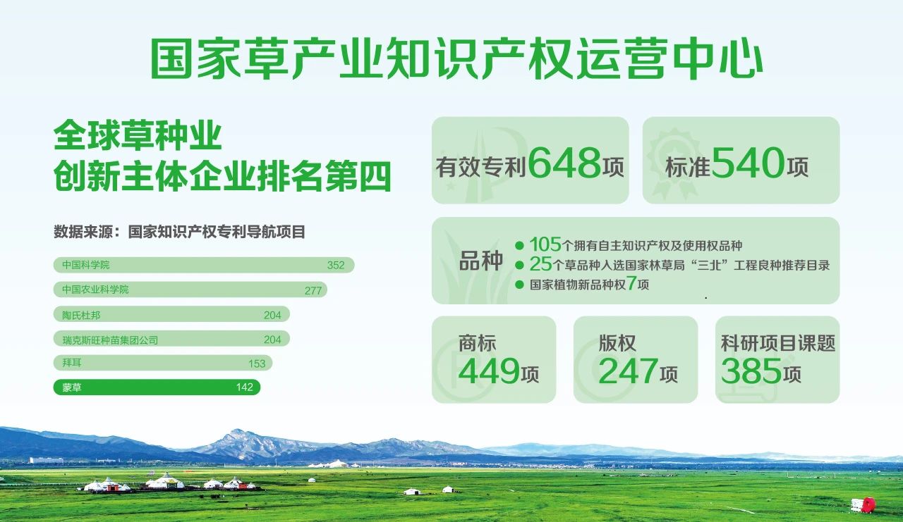 基于敕勒川草原等各类草原生态修复实践,蒙草科研团队将技术经验转化为可复制的行业规范,编制《退化草地修复技术规范》国家标准、《沙化草原治理技术规程》行业标准等各类标准540项,推动生态治理科学化、标准化发展。同时集成草种科技专利集群,从创新育种、机械研发、产品应用等多方面开展技术创新,获得授权专利648项,全球草种业创新主体企业排名第四,持续推进种业核心技术突破,解决生态治理和草产业发展的技术模式单一、产业化程度低等痛点。