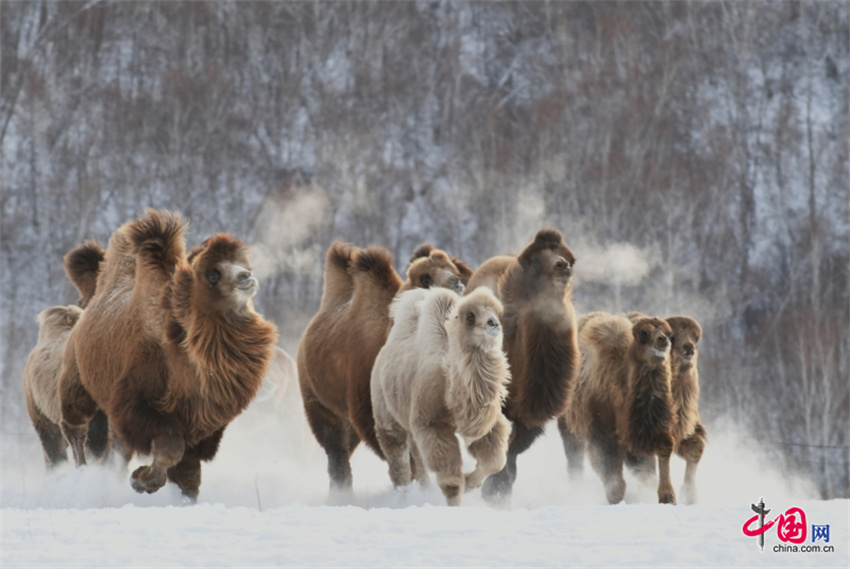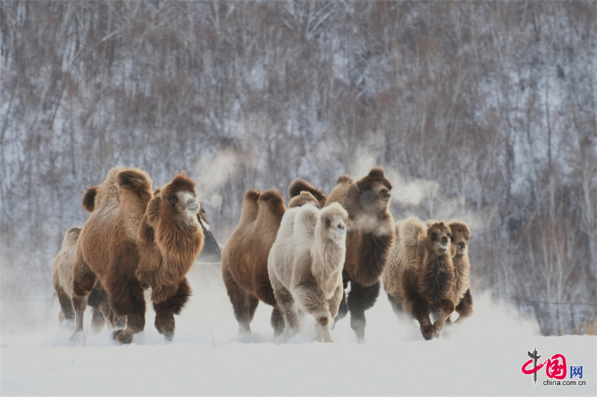 不远处的驼道上,数十峰骆驼组成的驼群昂首阔步,奔腾的蹄声与清脆悠扬的驼铃声交织回荡,与茫茫雪原、湛蓝天空构成一幅独具韵味的冬日草原画卷,吸引来自各地的摄影爱好者们纷纷举起相机定格下一幕幕精彩,沉浸式感受游牧文化的野性与豪迈。