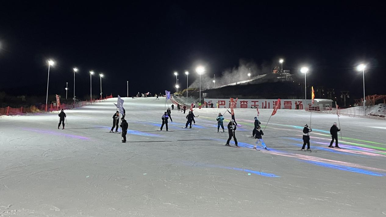 不远处的雪场上,游客们纷纷加入夜滑队伍,在雪道上尽情驰骋(摄影:宋浩)