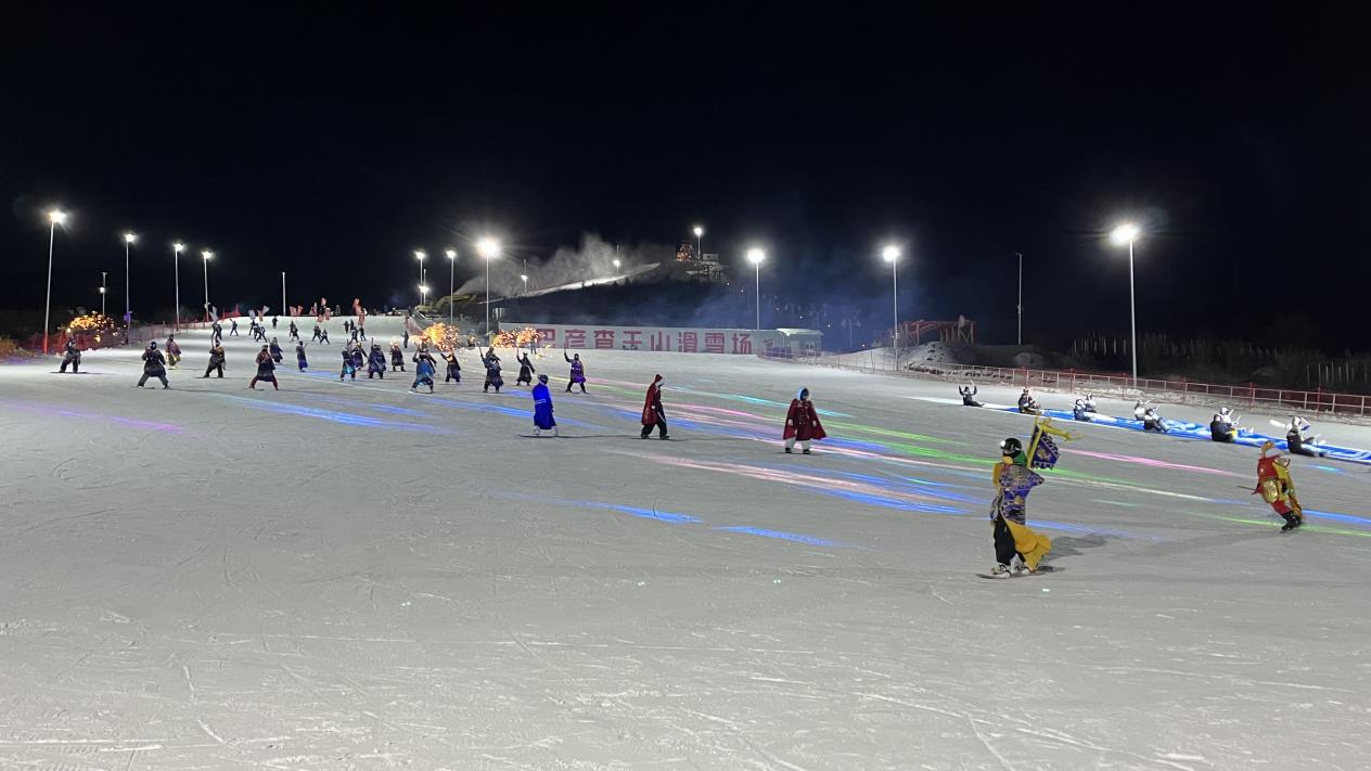 滑雪表演现场,由滑雪场教练、滑雪爱好者及高校学生组成的表演团队身着特色服饰惊艳亮相(摄影:贾功博)